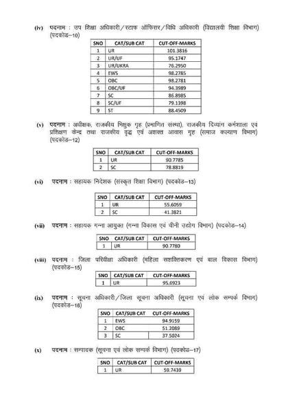 • कट ऑफ मार्क्स को पद, वर्ग (सामान्य, ओबीसी, एससी, एसटी) एवं उपश्रेणियों के अनुसार प्रकाशित किया गया है।