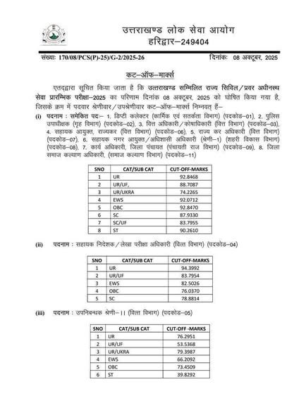 देहरादून, 9 अक्टूबर 2025 – उत्तराखण्ड लोक सेवा आयोग (UKPSC) ने उत्तराखण्ड सम्मिलित राज्य सिविल / प्रवर अधीनस्थ सेवा प्रारम्भिक परीक्षा-2025 के लिए पदवार, श्रेणीवार तथा उपश्रेणीवार कट ऑफ मार्क्स (Cut-off Marks) की आधिकारिक घोषणा कर दी है।