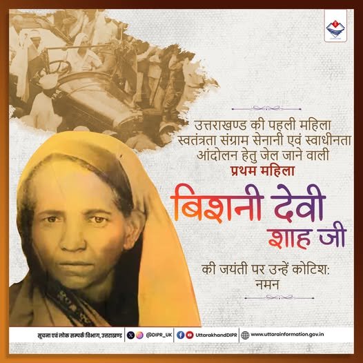 उत्तराखण्ड की प्रथम महिला स्वतंत्रता संग्राम सेनानी और स्वाधीनता आंदोलन के दौरान जेल जाने वाली पहली महिला क्रांतिकारी बिशनी देवी शाह जी की जयंती पर आज समूचा प्रदेश उन्हें श्रद्धा और सम्मान के साथ याद कर रहा है। बिशनी देवी शाह न केवल उत्तराखण्ड की गौरवशाली इतिहास की प्रतीक हैं, बल्कि उन्होंने आज़ादी के आंदोलन में महिलाओं की सक्रिय भूमिका का भी मार्ग प्रशस्त किया।