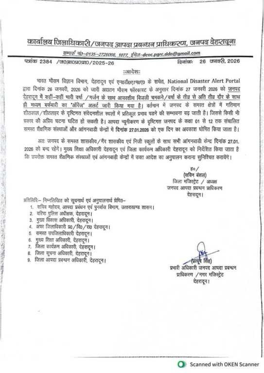 अतः जनपद के समस्त शासकीय / गैर शासकीय एवं निजी स्कूलों के साथ सभी आंगनबाडी केन्द्र दिनांक 27.01. 2026 को बन्द रहेंगे। मुख्य शिक्षा अधिकारी देहरादून एवं जिला कार्यकम अधिकारी देहरादून को निर्देशित किया जाता है कि उपरोक्त समस्त शैक्षणिक संस्थाओं एवं आंगनबाड़ी केन्द्रों में उक्त आदेश का अनुपालन कराना सुनिश्चित करायेंगे