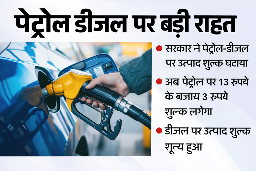 अंतरराष्ट्रीय स्तर पर तेल की कीमतें बढ़ने से देश की तेल विपणन कंपनियों पर भारी दबाव में था और उनका घाटा बढ़ रहा था। अब सरकार ने तेल कंपनियों को बड़ी राहत देते हुए केंद्रीय उत्पाद शुल्क घटाने का फैसला किया है। आइए जानते हैं इस फैसले का क्या असर होगा। पश्चिम एशिया में जारी संघर्ष और उसके कारण उपजे ऊर्जा संकट के बीच सरकार ने बड़ा कदम उठाया है। दरअसल वित्त मंत्रालय द्वारा 26 मार्च को जारी की गई अधिसूचना के अनुसार, प्रति लीटर पेट्रोल-डीजल पर 10 रुपये एक्साइज ड्यूटी घटाने का फैसला किया है। सरकार के इस कदम के बाद पेट्रोल पर एक्साइज ड्यूटी, जो पहले 13 रुपये थी, वो अब घटकर 3 रुपये रह गई है और डीजल पर एक्साइज ड्यूटी, जो पहले 10 रुपये थी, वो अब शून्य हो गई है। तेल कंपनियों को सरकार ने दी बड़ी राहत